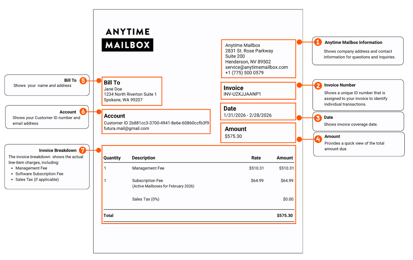 Displays Anytime Mailbox’s company address and contact information for billing-related inquiries.